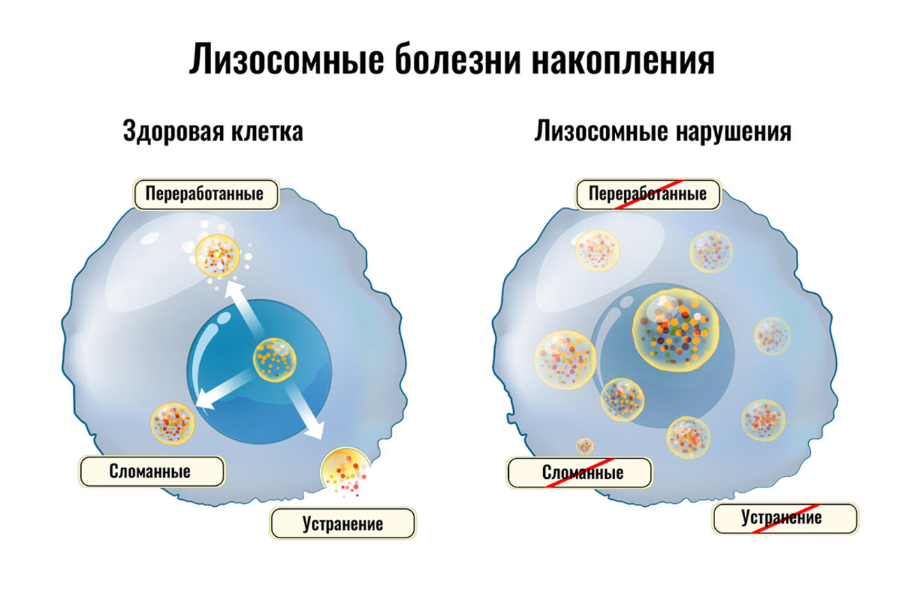 Лизосомные болезни — это группа редких наследственных заболеваний, возникающих из-за дефицита ферментов в лизосомах, которые отвечают за расщепление сложных молекул. Приводит к накоплению непереваренных веществ в клетках и тканях, вызывая их повреждение.